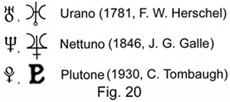 I domicilî di Saturno sono il Capricorno e l'Aquario; gli esilî sono il Cancro e il Leone; l'esaltazione è in Bilancia, la caduta in Ariete. Nella Fig. 20 sono elencati i pianeti di recente scoperta e, a fianco dei simboli loro attribuiti, è indicata la data della scoperta e il nome dello scopritore.URANO (1781).